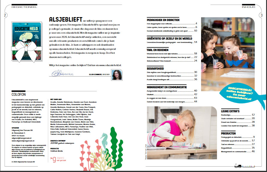 Het magazine biedt inspiratie en biedt leuke extra's op het gebied van pedagogiek en didactiek, begaafdheid, taal en rekenen, oriëntatie op jezelf en de wereld en management en communicatie.